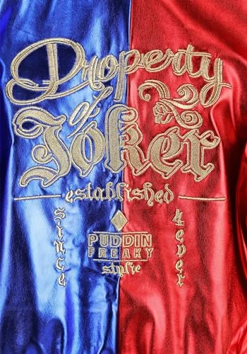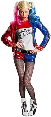 Hey Puddin! Get ready to cause some mischief in this officially licensed DC Comics, Suicide Squad Harley Quinn costume. White 3/4 sleeve lightweight crop top with red neckline and black text on front that reads, “Daddy’s Lil Monster,” red double-striped sleeves and left sleeve has blue end; pull on sequined shorts with red side blue side; black belt with silver studs; red and blue jacket with gold zippered front, back of jacket features gold embroidered text that reads, “Property of Joker Established Since 4ever, Puddin, Freaky, Style.” You’ll have everything you need to transform into Harley Quinn with this costume set, grab Mistah Jay and get ready for a devious-fun filled evening! Please read before buying; costumes are not sized the same as apparel, please review Charades women’s size chart in images, read reviews and Q & A for best fit, do not choose based on clothing size. Pair with Charades’ Joker costume for a fun couples themed look! Costume wig, tights and boots available separately. Charades also offers officially licensed DC Comics Batgirl, Riddler and the Flash costumes great for group dress up fun. Great for any time of the year, comic con, cosplay, parades, live action role play, fun runs, movie nights and of course Trick or Treat and Halloween too! From hilarious to sexy, historical to trendy, Charades offers a broad range of selection with something for every costume occasion. With a costume made by Charades you’re sure to look your best. From inspiration, through design and construction, Charades takes pride in quality materials and excellent finished products; let Charades help you get your costume on!