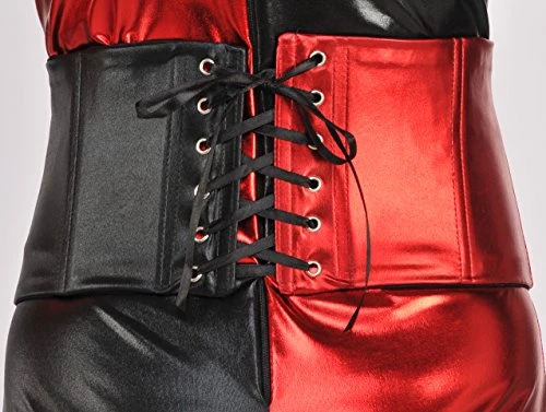 Please review Delicious Costume size chart before selecting size. Officially licensed Harley Quinn costume jumpsuit is made of black and red stretch lamé with contrast color diamond shaped appliques stitched onto each side of legs and arms. Long zipper at the center back. The costume comes with a fully-lined white satin collar with pom poms and wide Velcro neck closure. A black mask made of foam backed stretch lamé with an elastic Velcro closure is also included. The matching jester style hat is stuffed to hold its shape and made of black and red stretch lamé with pom poms tacked to each horn. Completing the costume is a matching fully-lined waist cincher with boning in all seams, metal grommeted lace up closure featuring satin ribbon in front. The Delicious costume collection is filled with fashion-forward styles and figure-friendly designs; from flappers and cops to gangsters and goddesses, Delicious has the flirty styles you want. Delicious costumes are designed and crafted with high quality fabrics and trims for superior fit and style.
