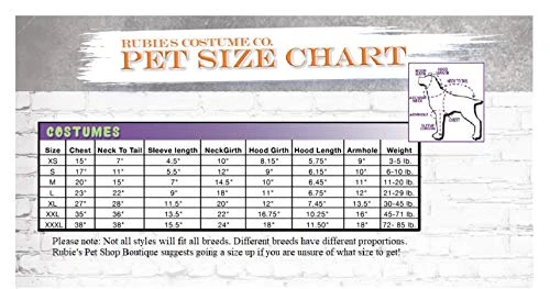 - READ THE RUBIE’S PET SIZE CHART and WATCH THE SIZING INSTRUCTION VIDEO, do not select size based on breed; consider costume style and animal shape before ordering