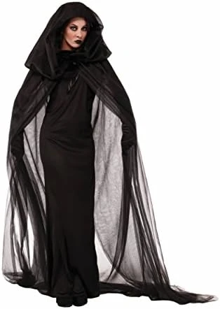 - The haunted costume includes black dress and hooded cape