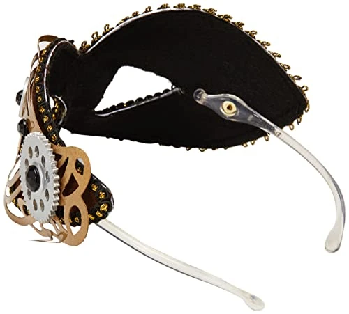 - Adult steampunk half mask with eyeglass arms is metallic gold with a decorative gold panel covering one half and adorned with gold and silver gears