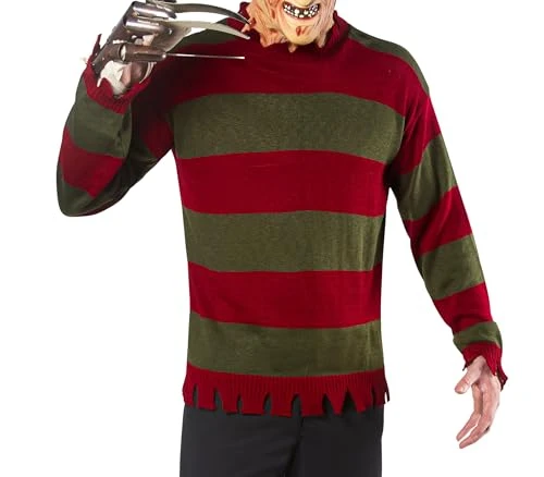 This sweater is a little pricey but well made and very happy with the fit. I am 6’5″ and the extra large was plenty long enough. If you are dressing up as Freddy you need ro get the sweater right. I especially appreciate that the sweater had some intentional shredding around the hands to make it more true to character. Will try to work in as an ugly sweater contest for Christmas.