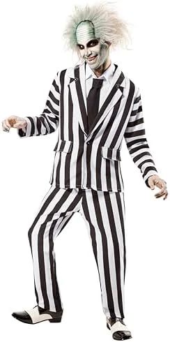 Beetlejuice Beetlejuice Beetlejuice! Now you can dress up as the mischievous ghost in this officially licensed deluxe Beetlejuice costume set. Features white and black vertically striped costume long sleeve jacket with notch lapel and button front closure, matching striped pants white shirtfront with collared neckline and black necktie. Includes jacket, pants, white shirt front with black tie; shoes, wig and other accessories shown sold separately. Rubie’s Costume Company has been bringing costumes and accessories to the world since 1950. As the world’s leader, we take our mission seriously to make dressing up fun! Mascots, rental quality costumes, masks, wigs, accessories, shoes, and every significant licensed costume you want to wear can be found under the Rubie’s brand. Still family owned and still family focused, Rubie’s brings you fun for every season: Halloween, Christmas, Mardi Gras, Easter, and every occasion in-between.