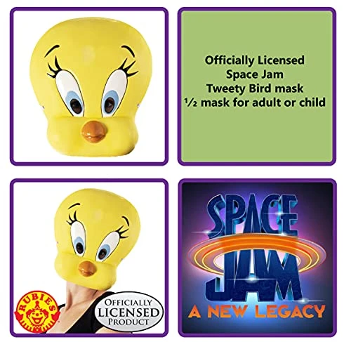 OFFICIALLY LICENSED Space Jam 2: A New Legacy Tweety Bird Plastic Half-Mask. Plastic half-mask with elastic and hook-and-loop closure in back. Designed for use by children and adults ages 6+. Join the fun with costumes and accessories from Space Jam 2. Family-focused, and based in the U.S.A. since 1951, Rubies has classic and licensed costumes and accessories in sizes and styles for your entire family.