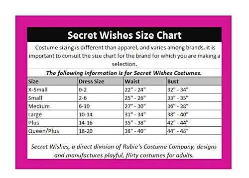 Secret Wishes features costumes for playful adults, for lots of different playful occasions. Secret Wishes sizing: XS 0 to 2, Small 4 to 6, Medium 8 to 10, and Large 10 to 12. Secret Wishes is a member of the Rubie’s Family of Costumes, designing and manufacturing costumes and accessories since 1950. Based in Long Island, New York.